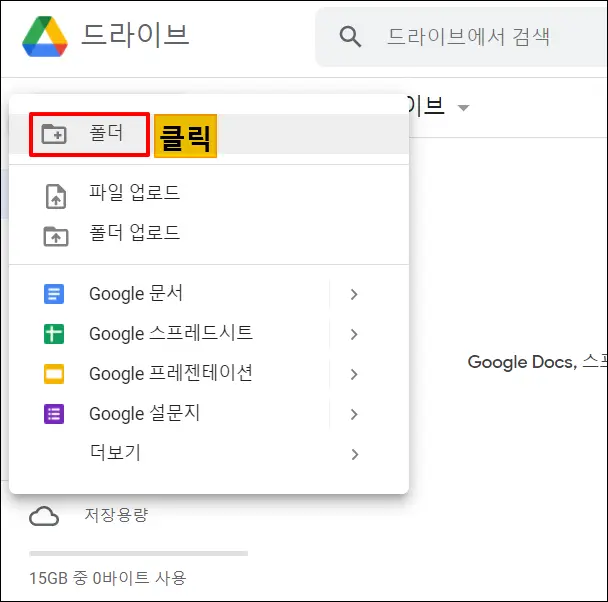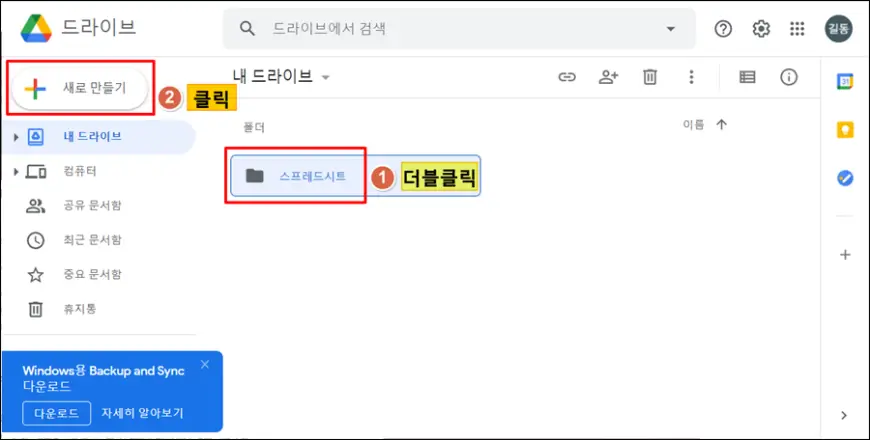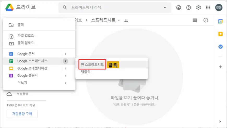 구글 드라이브 새로 만둘기, 폴더 생성, 스프레드 시트 만들기