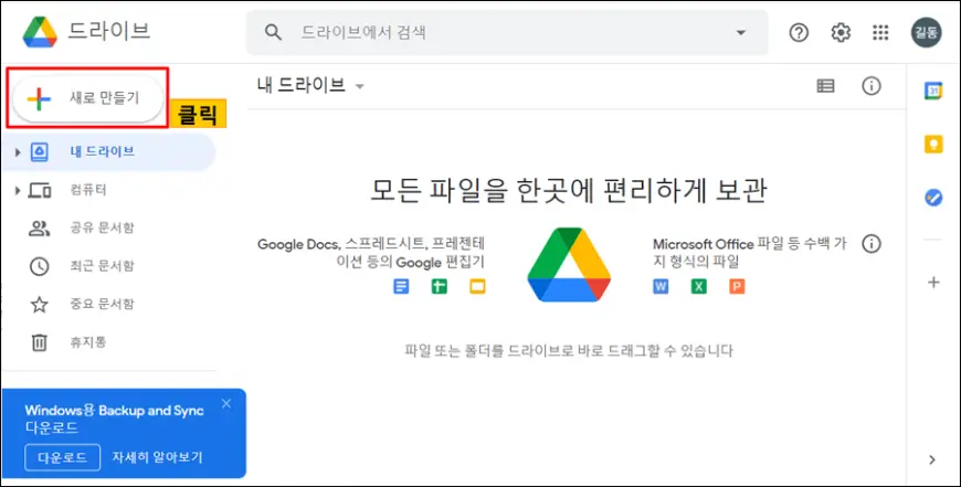 구글 드라이브에 접속하여, 스프레드시트 파일을 관리하기 위한 폴더를 만들어 보겠다. 좌측 상단의 새로 만들기를 버튼을 클릭한다.