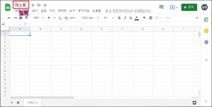 스프레드시트 파일이 생성되었다. 좌측 상단의 “제목 없는 스프레드시트”의 제목을 입력한다. 입력한 제목이 파일명이 되어 드라이브에 저장되었다. 예로 제목을 “테스트”로 입력했다.