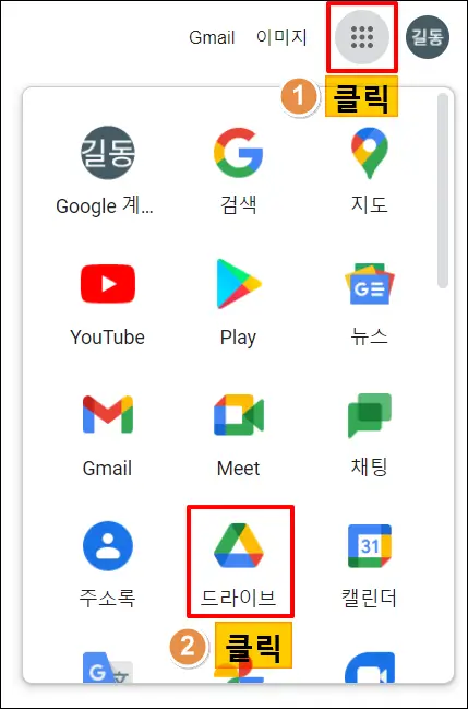 브라우저 우측 상단의 Google 앱 버튼을 클릭하고, 하단에 나타나는 여러 앱 중 “드라이브” 아이콘을 클릭한다.