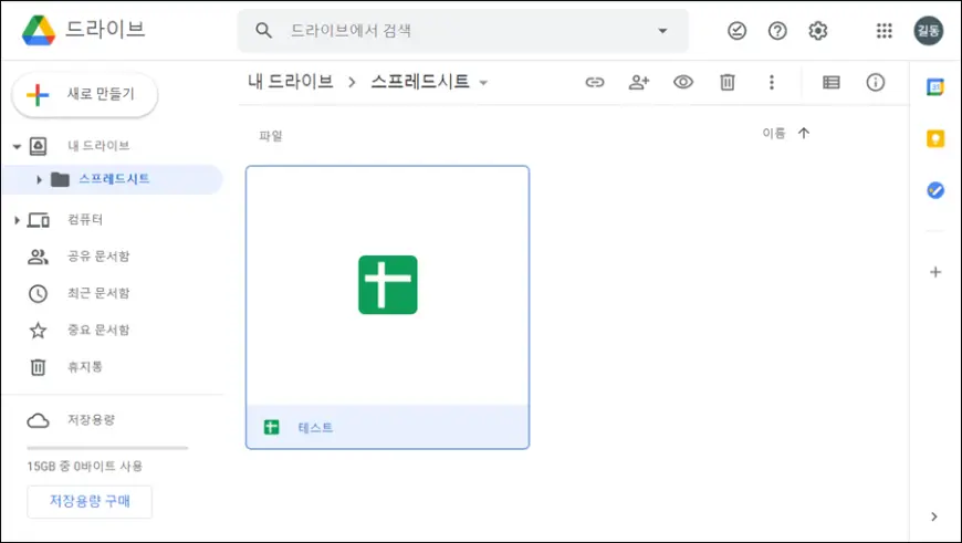 드라이브로 돌아와 “테스트”로 저장한 스프레드시트 파일을 확인할 수 있다.