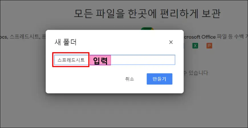 새 폴더 창이 나타나면 폴더 이름을 입력하고 만들기 버튼을 클릭한다. 예로 “스프레드시트”로 폴더 이름을 입력했다.