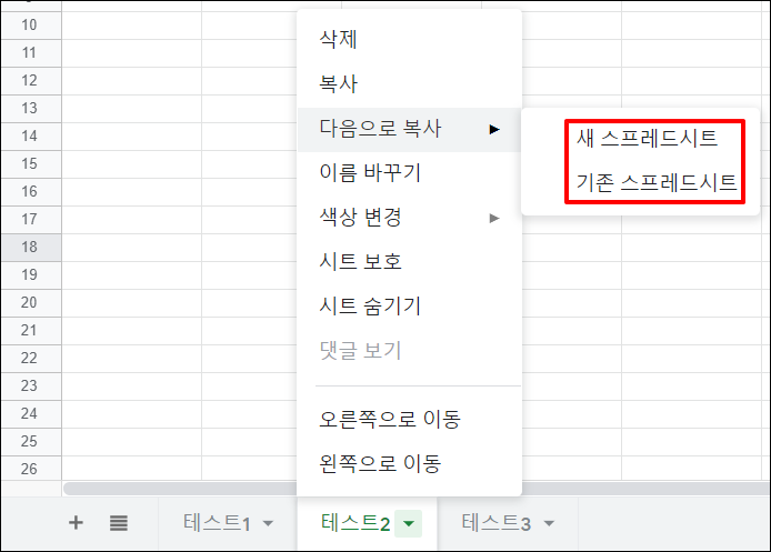 선택한 시트를 새 스프레드시트와 기존 스프레드시트로 복사한다.