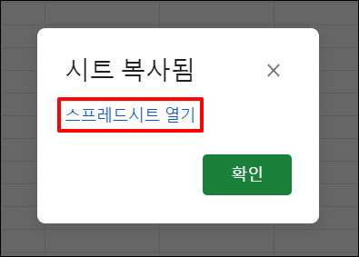 새 스프레드시트로 복사한다. 복사가 완료되면 알림창을 통해 바로 복사 된 새 스프레드시트를 열어 확인 가능하다.