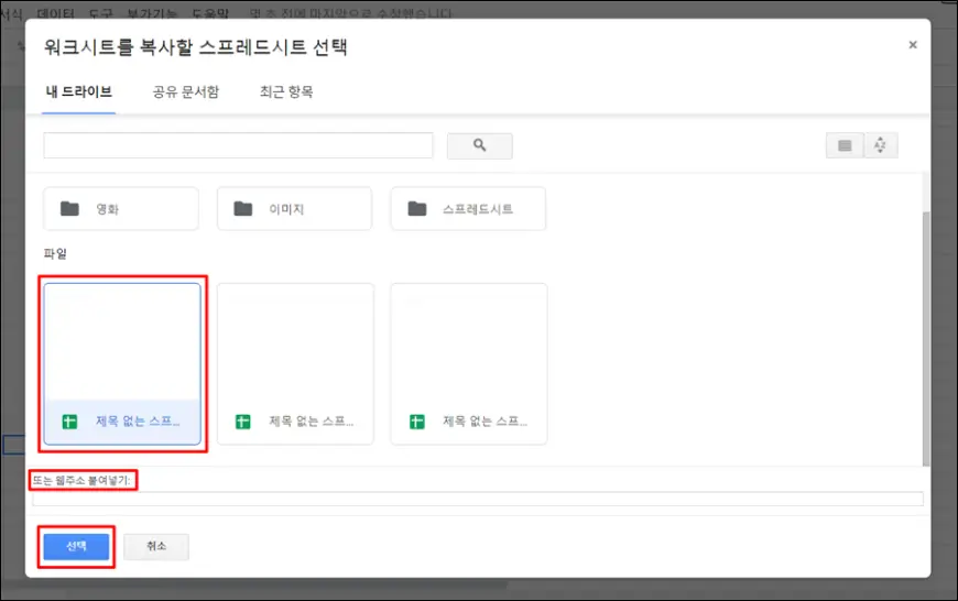 기존 스프레드시트로 복사한다. 구글 드라이브에 저장된 기존 스프레드시트 중 하나를 선택할 수 있다. 혹은 링크 주소를 붙여넣기하여 선택할 수도 있다.