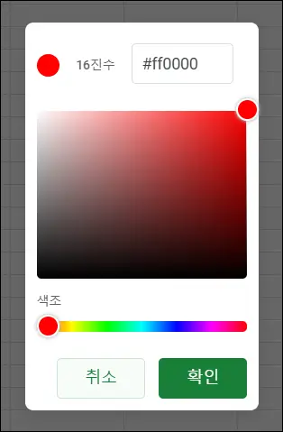 색상표의 하단 + 아이콘을 클릭하면 16진수 RPB값을 직접 입력하거나 색상 피커를 통해 색상을 변경할 수 있다.