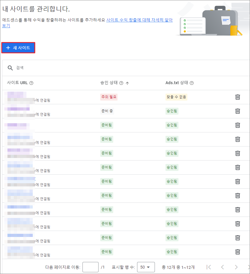 ③ 구글 애드센스 – 사이트에 접속하여 + 새 사이트 버튼을 클릭한다.
