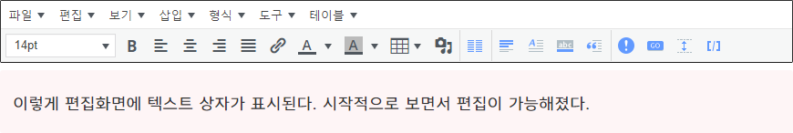 Code language: CSS (css)코드 추가 후 아래 이미지처럼 편집화면에 텍스트 상자가 표시된다. 이제 보면서 텍스트 상자에 글 입력이 가능해졌다. 줄 바꿈은 <br>을 사용해야 한다.